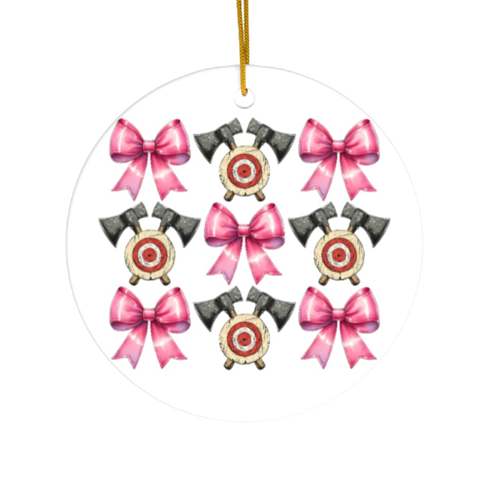 You're taking a peek at the product Coquette Bow Axe Throwing Axe Thrower Mothers Day Ceramic Ornaments For WHITE belong theme Ceramic Ornaments at Printblur