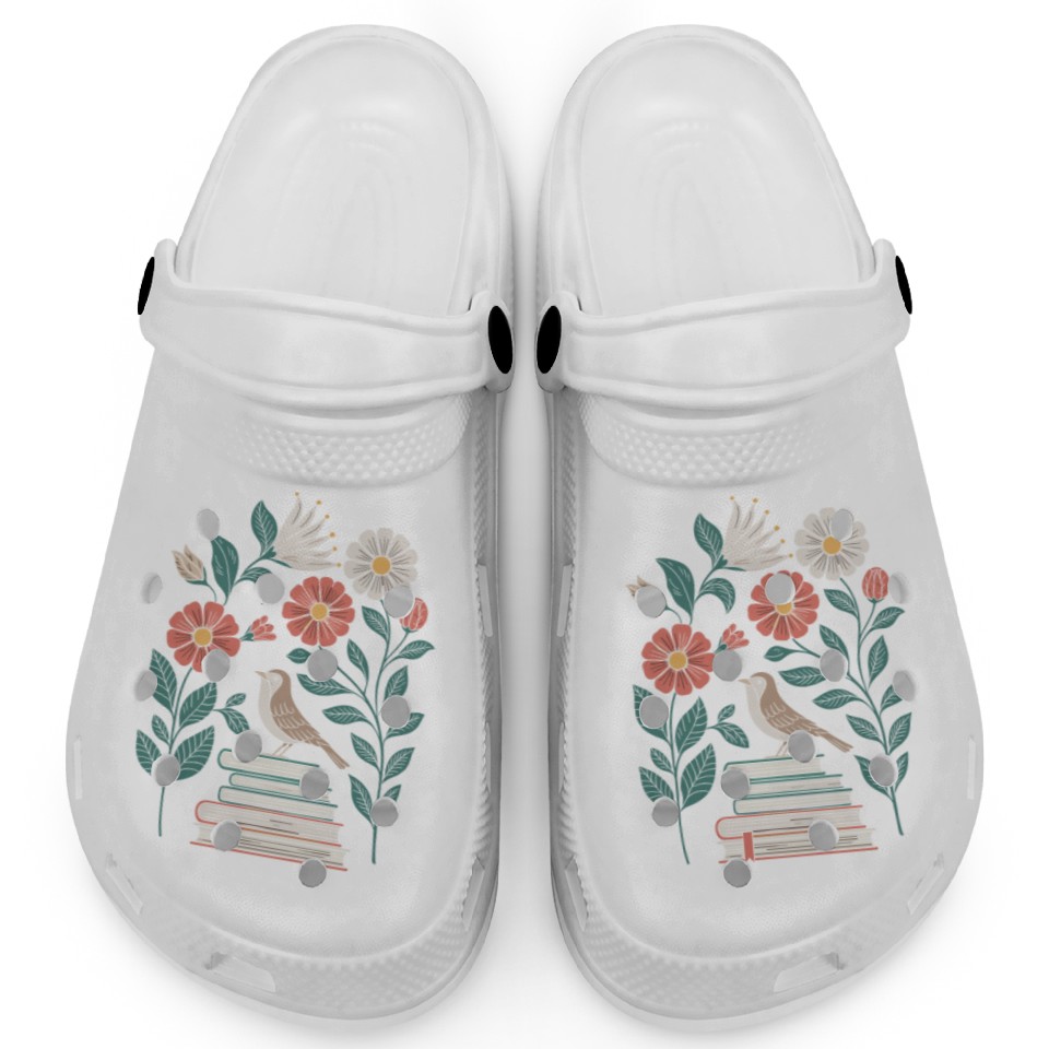 Cottagecore Bird on Books with Flowers Delight Clogs
