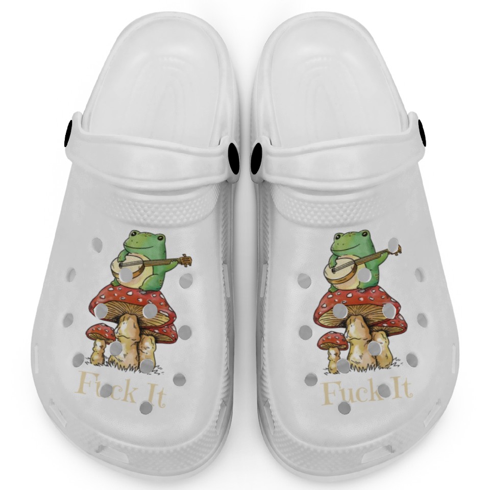 Shop for attractive Cottagecore Frog Playing Guitar says Fuck It Clogs or see more Clogs products on https://printblur.com right now!