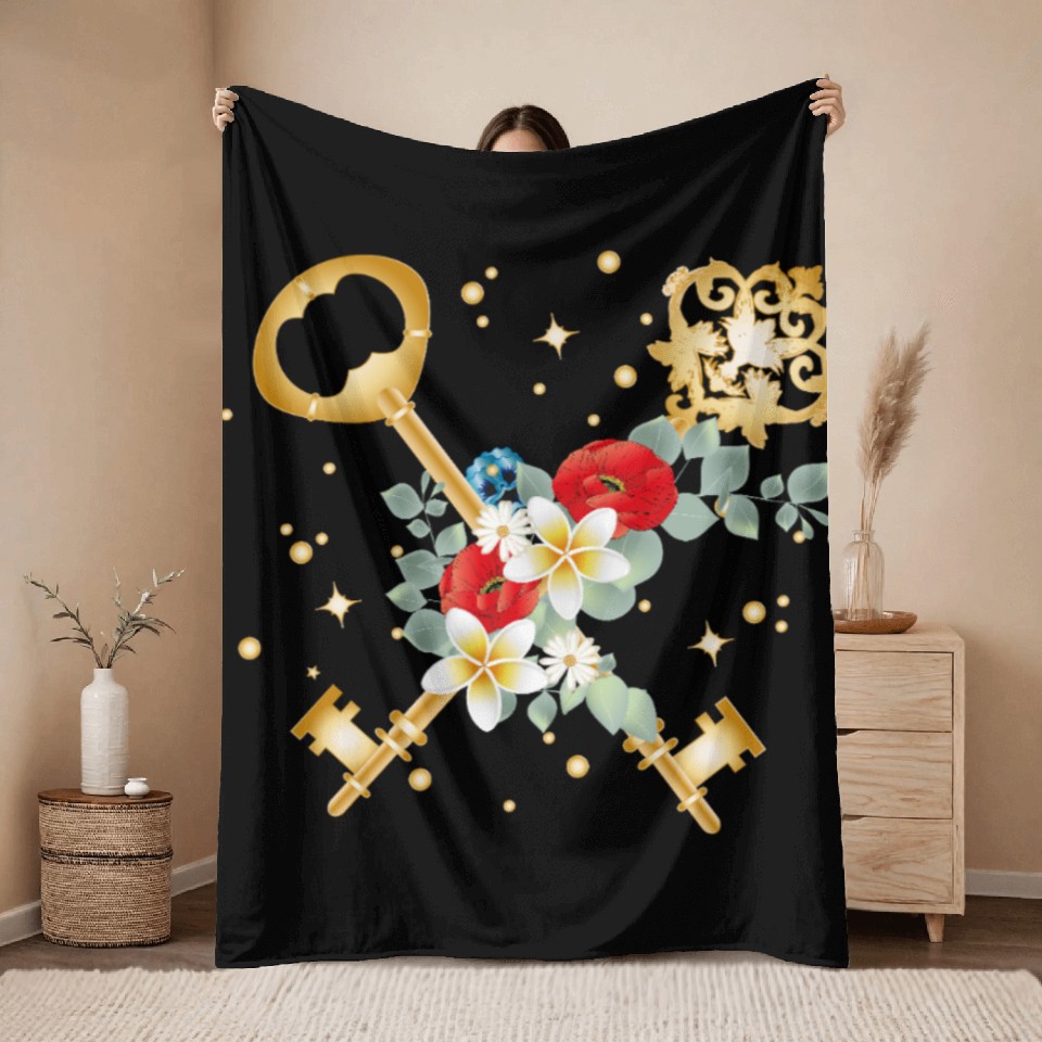 You're looking at the eye-catching product Crossed Keys with Flowers in Gold Style Throw Blankets For Black belong theme Throw Blankets at Printblur