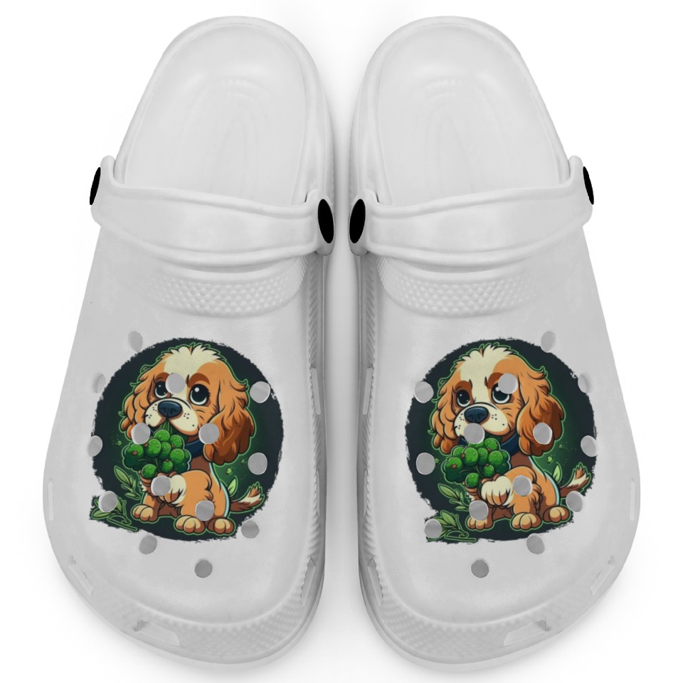 You're looking at the eye-catching product Cute dog eats green broccoli vegetables Clogs For Kids WHITE belong theme Clogs at Printblur