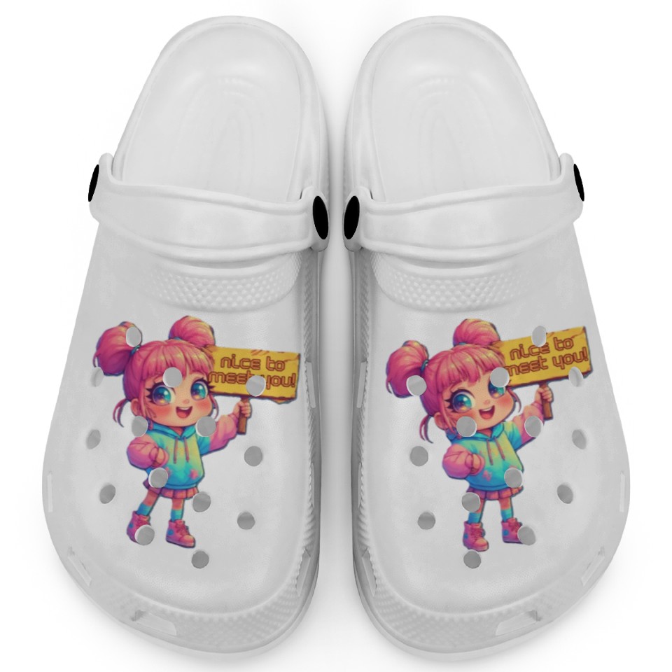 The item hot trend you're looking at is Cute Girl Holding Welcome Sign Clogs For Kids WHITE belong theme Clogs at Printblur