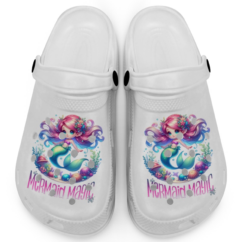 You're taking a peek at the product Cute Mermaid Magic Graphic, Colorful Ocean Fantasy Clogs For Kids WHITE belong theme Clogs at Printblur