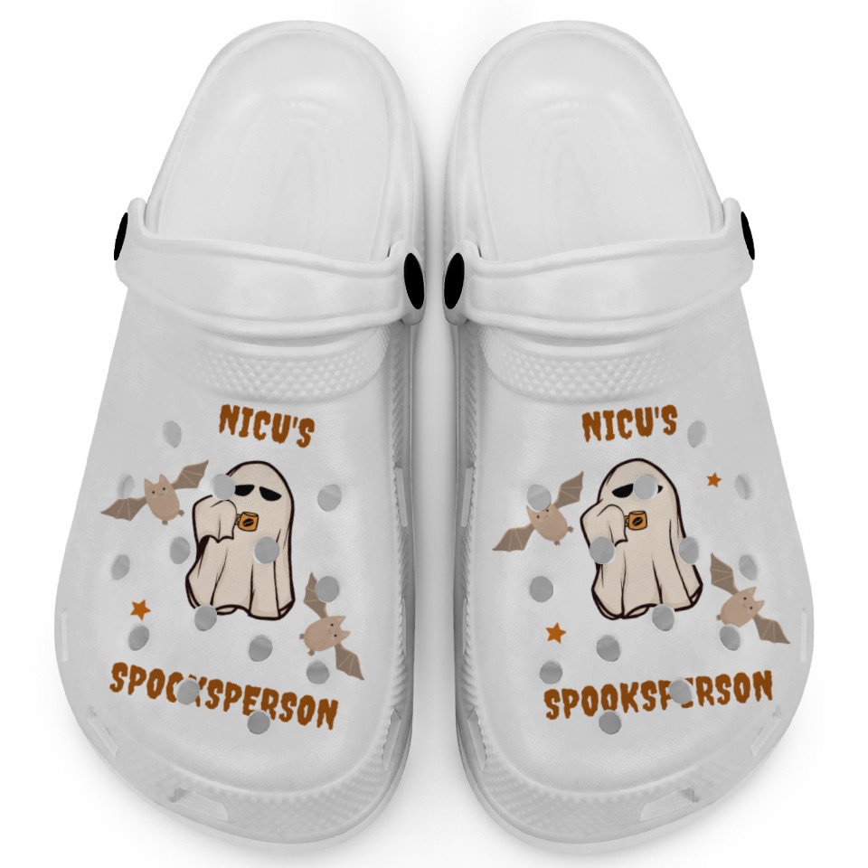 You are shopping for a stunning and trendy product Cute NICU Halloween | NICU official spooksperson Clogs For Kids WHITE belong theme Clogs at Printblur