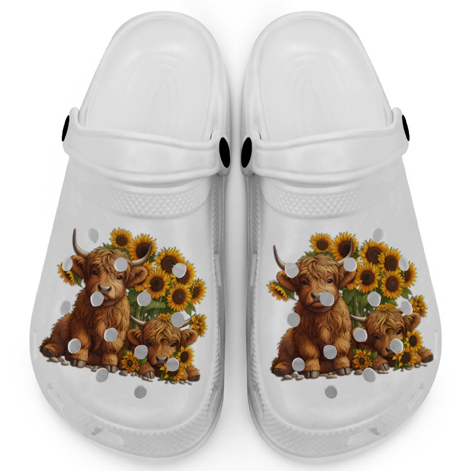 You are viewing an exclusive and elegant product Cute Scottish Highland Cow Sunflower Farmer Clogs For Kids WHITE belong theme Clogs at Printblur