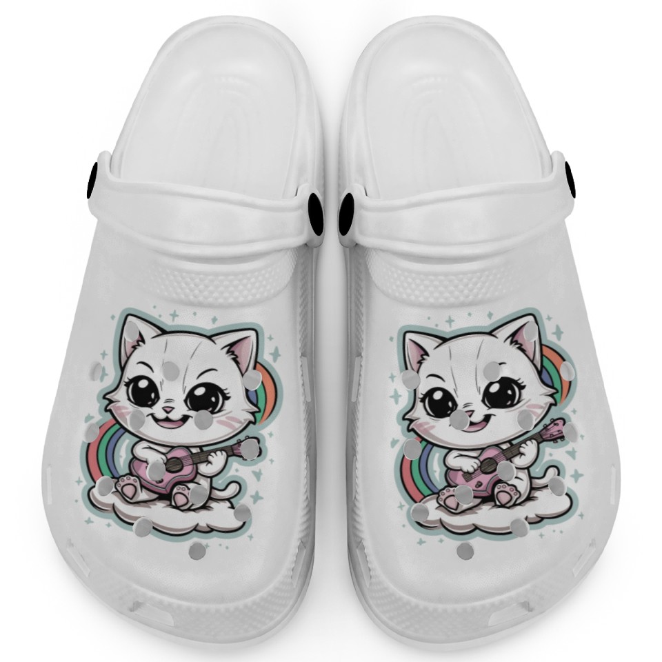 Buy stunning Cute White Cat Playing Guitar on Cloud - Rainbows Clogs or see more Clogs products at Printblur right now to receive many amazing discounts!