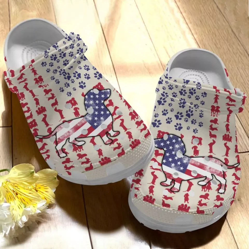 The item hot trend you're looking at is Dachshund Clog Whitesole American Flag Dachshund Clogs Clogsband Clog For Kids belong theme Clogs at Printblur
