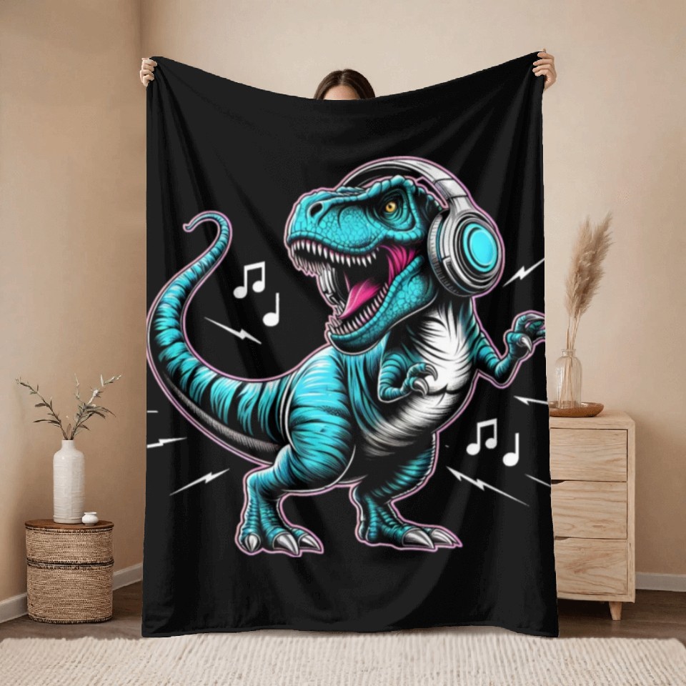You're looking at the eye-catching product Dancing Tyrannosaurus Rex with Headphone Throw Blankets For Black belong theme Throw Blankets at Printblur