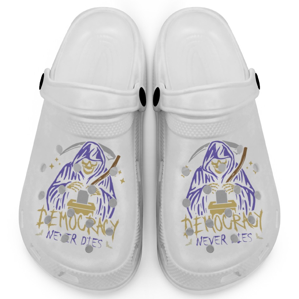 You are shopping for a stunning and trendy product Democracy Never Dies Spooky Halloween Voting Meme Clogs For Kids WHITE belong theme Clogs at Printblur