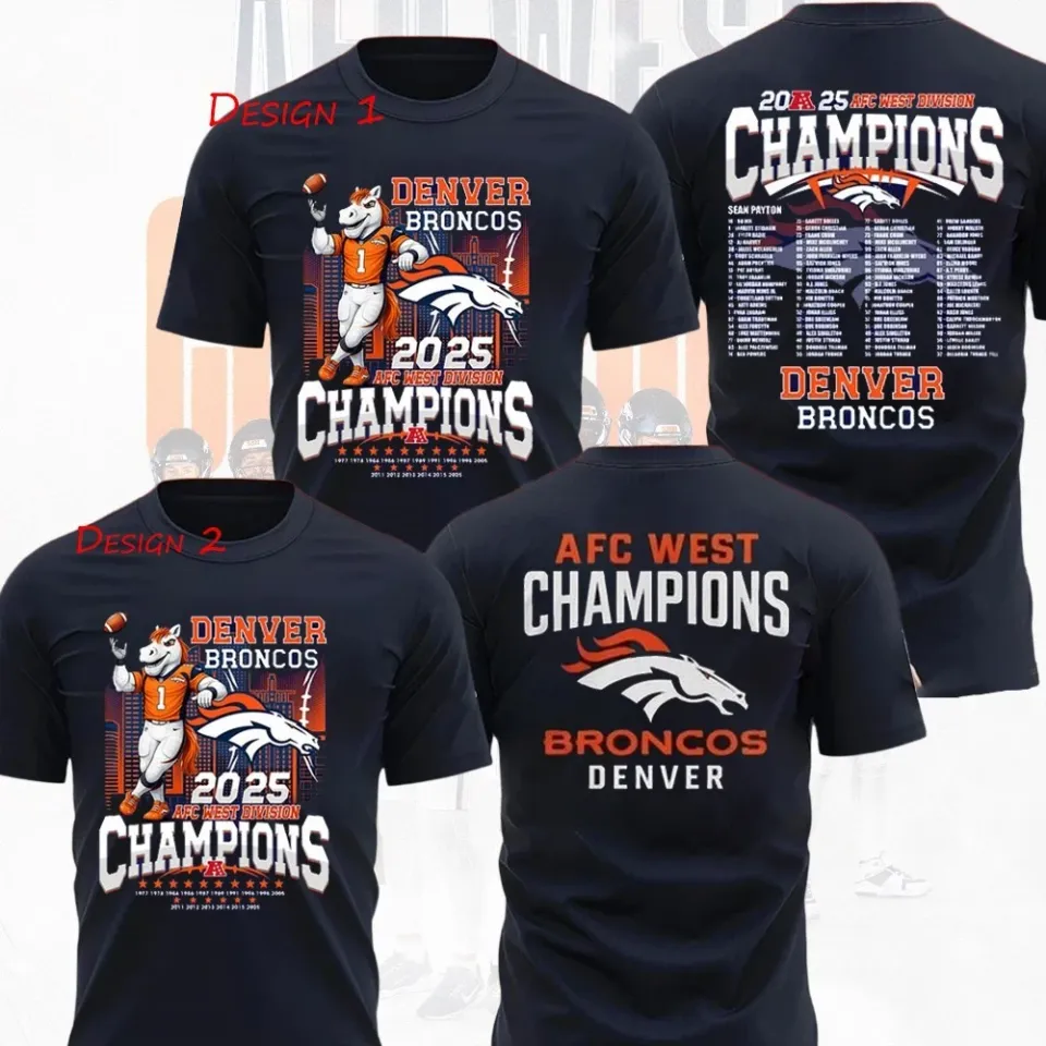 Buy stunning Denver Broncos 2025 AFC West Division Champions Both Side For Fans or see more Double Sided T-Shirts products at Printblur right now to receive many amazing discounts!