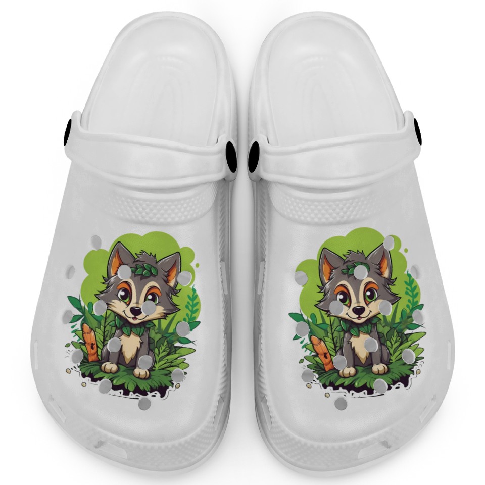 You are seeing a unique and impressive product Digital Art Wolf Puppy Wearing Blue Wig Sitting Clogs For Kids WHITE belong theme Clogs at Printblur
