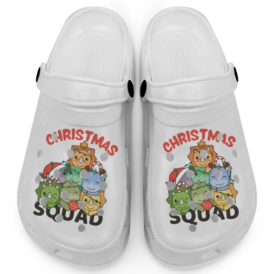 The product unique design you searched for is Dinosaur Christmas Tree Christmas Squad Dinos Clogs For Kids WHITE belong theme Clogs at Printblur