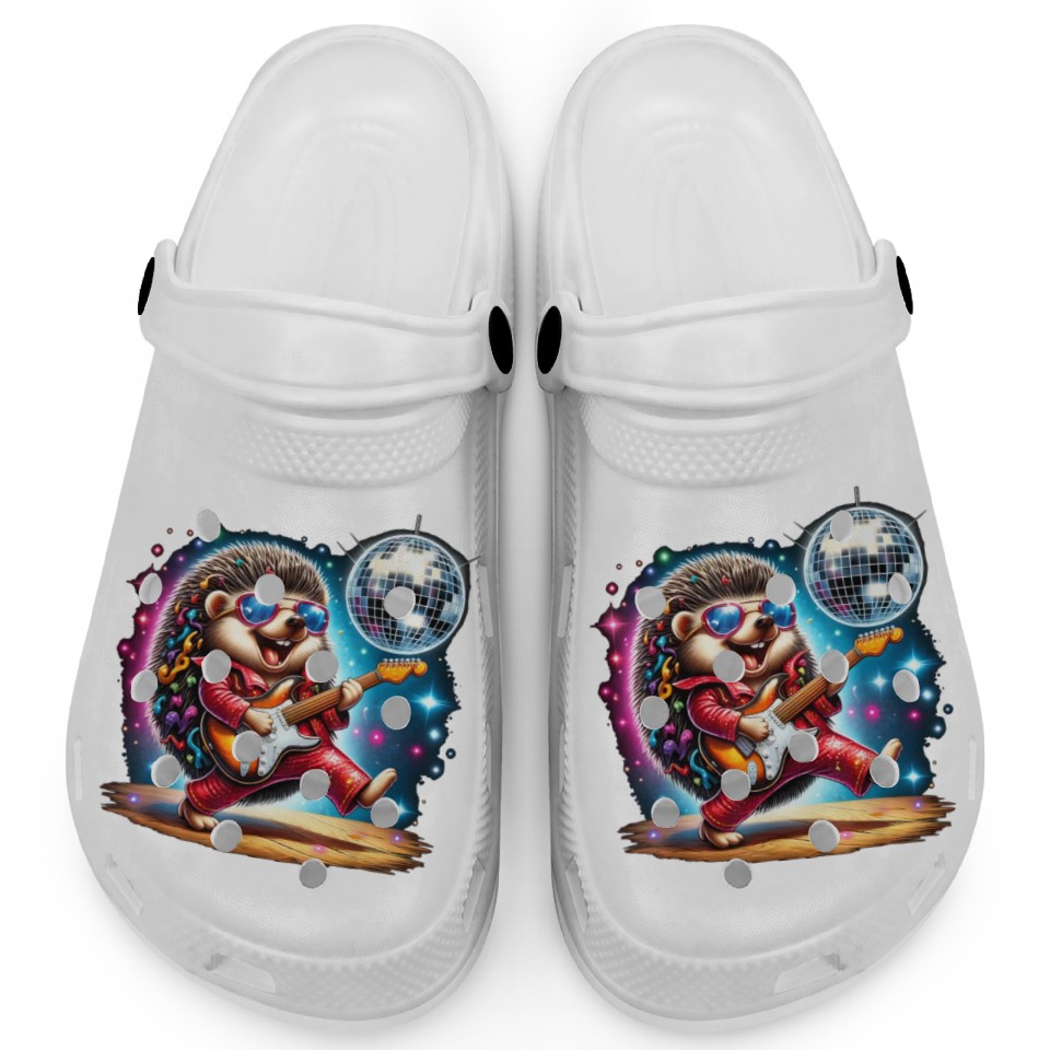 The product unique design you searched for is Disco Ball Guitar Hedgehog Clogs For Kids WHITE belong theme Clogs at Printblur