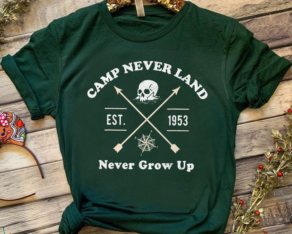 Buy eye-catching Disney Peter Pan Camp Never Land Est. 1953 Never Grow Up Shirt or see more T-Shirts products at Printblur shop now to explore many surprises from our shop!
