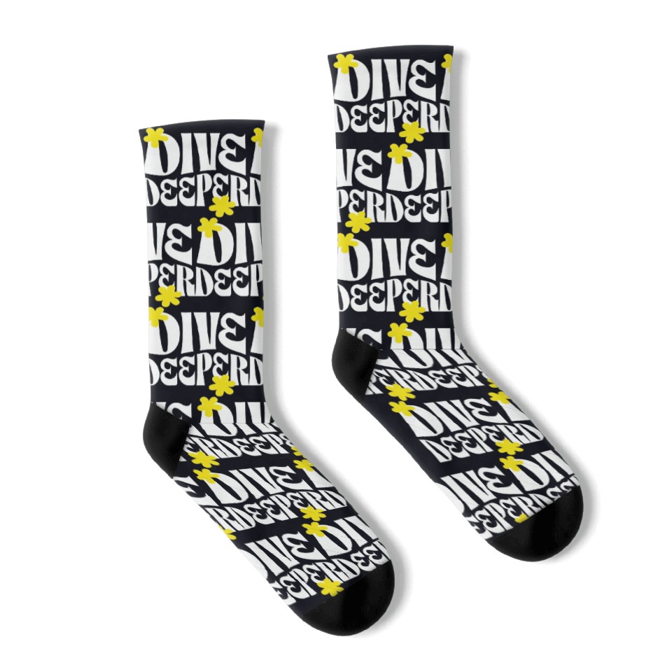 Shop for impressive Dive Deeper – Bold Typography with Floral Accents Socks or see more Socks products right now on Printblur to enjoy your happiness!