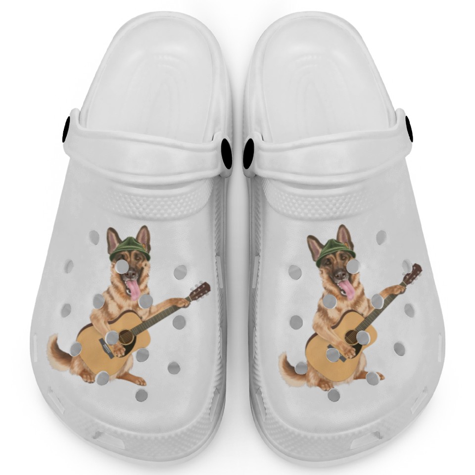 Own fascinating Dog playing the acoustic guitar - German Shepherd Clogs or see more Clogs products now from Printblur shop to enjoy your shopping time!