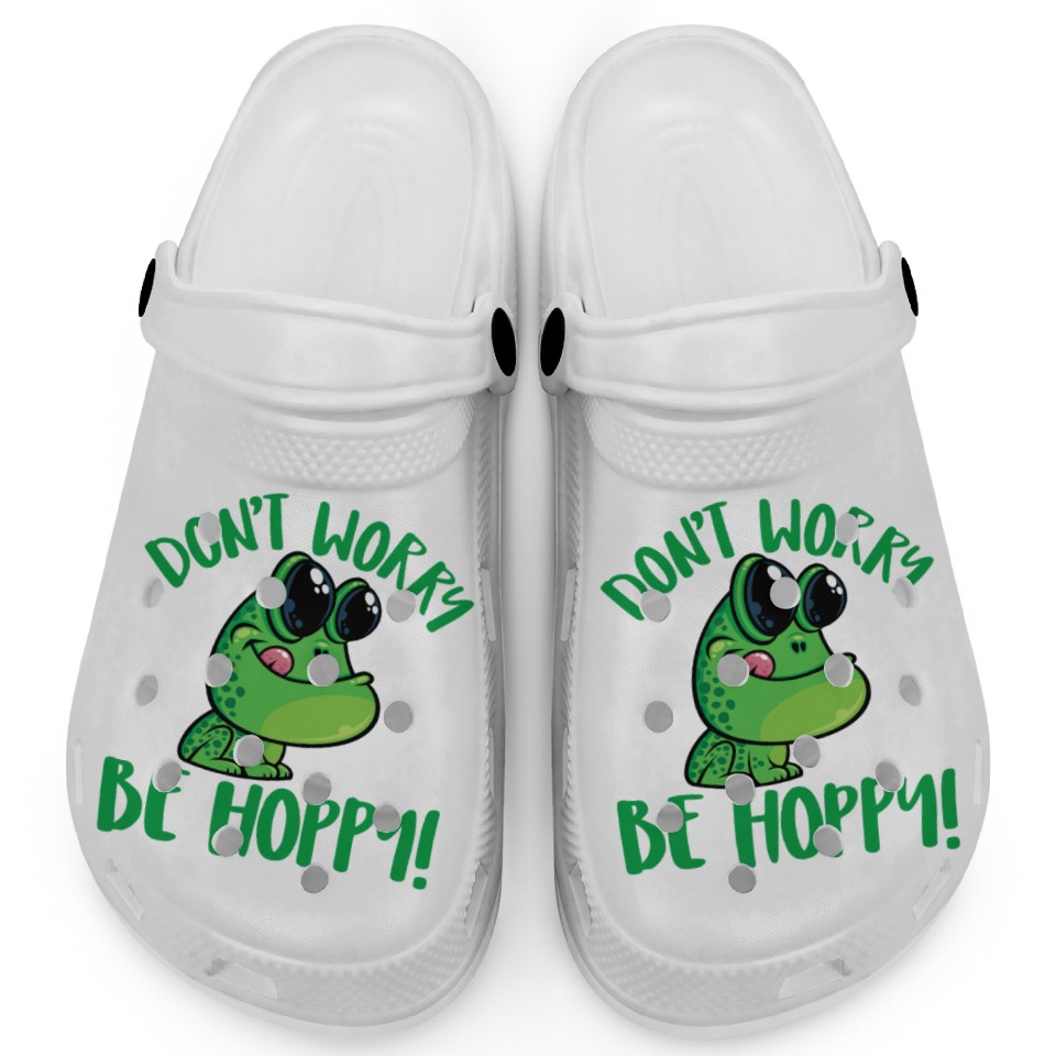 Buy eye-catching Don't Worry Be Hoppy Smiling Cartoon Frog Clogs or see more Clogs products at Printblur shop now to explore many surprises from our shop!
