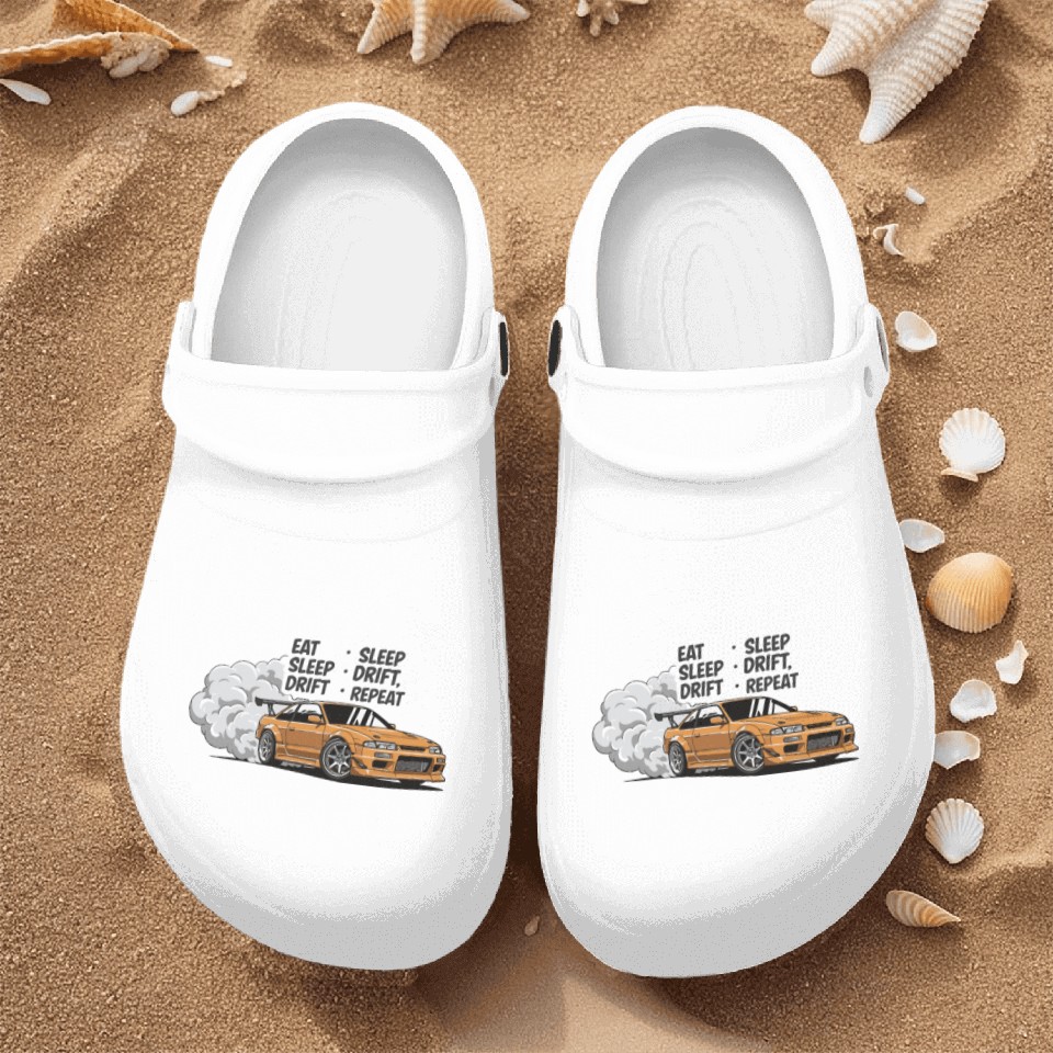 The item hot trend you're looking at is Eat Sleep Drift Repeat Nurse Clogs – Neon JDM Car Raci For Men WHITE belong theme Nurse Clogs at Printblur