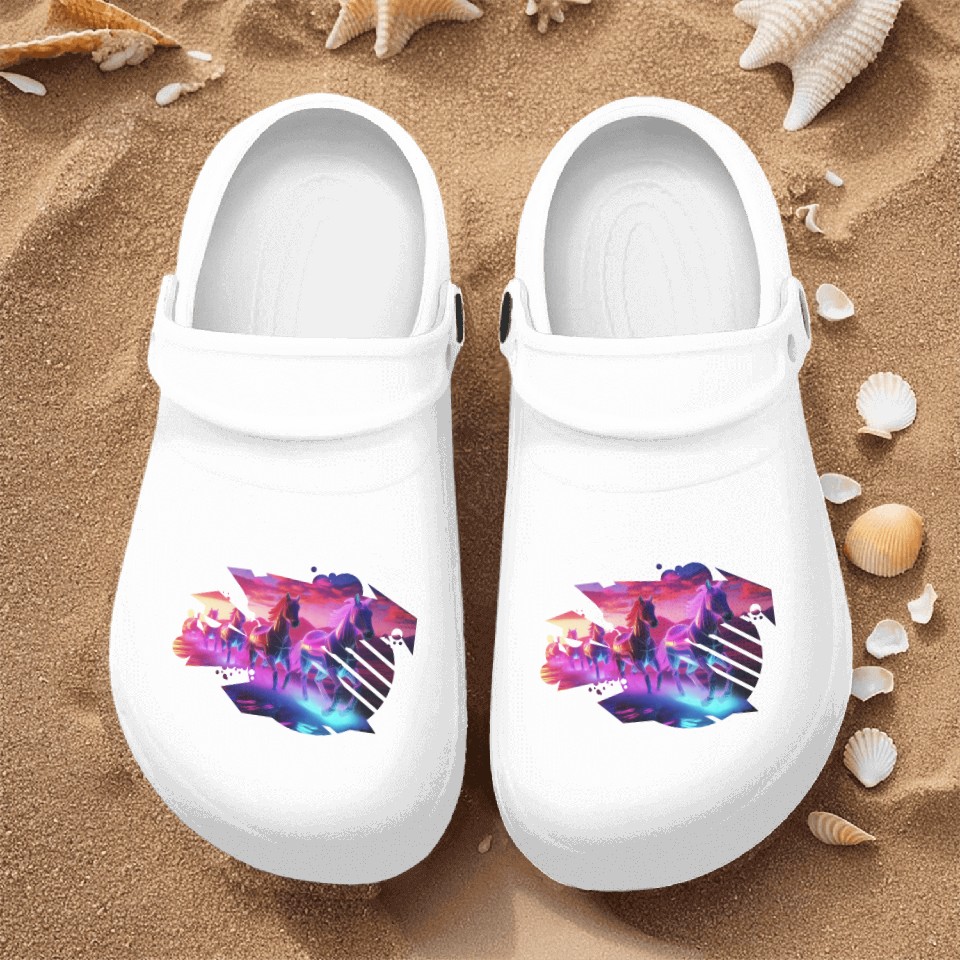 You are viewing one of the trendiest products Electric Herd - Synthwave Horses Nurse Clogs For Men WHITE belong theme Nurse Clogs at Printblur