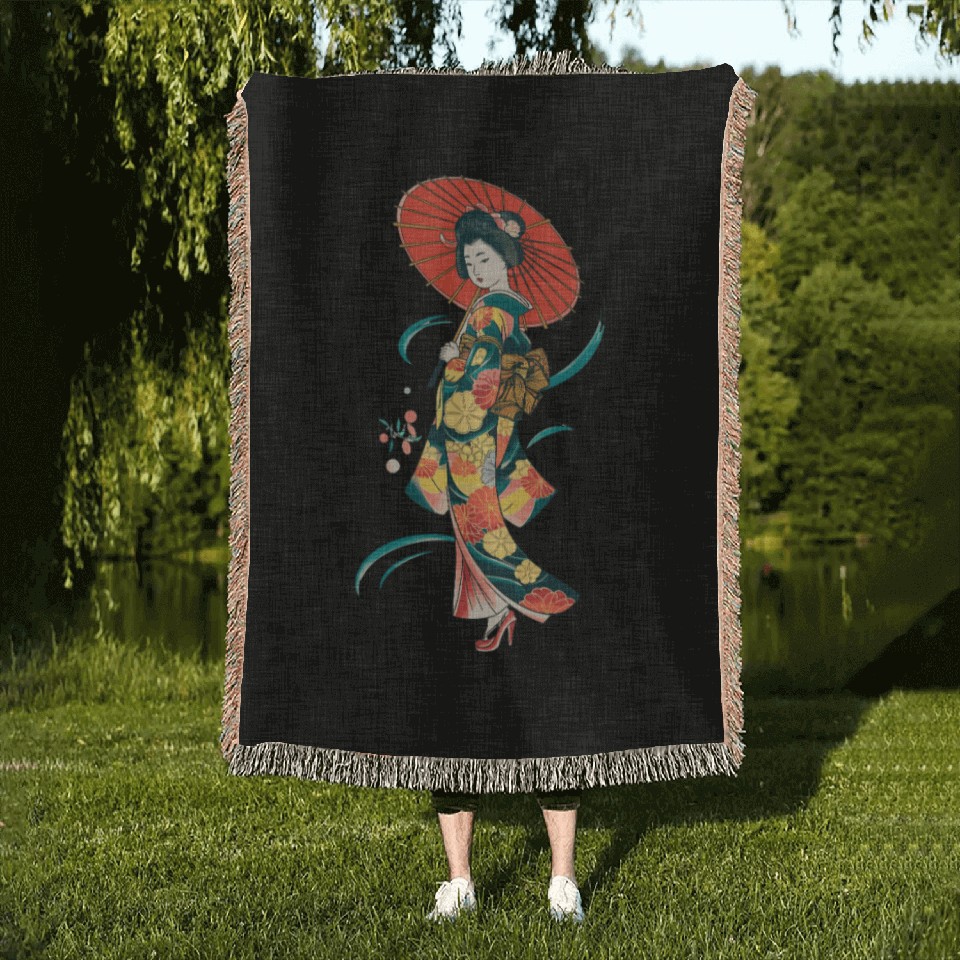 You are viewing an exclusive and elegant product Elegant Geisha with Red Parasol and Floral Kimono Woven Blankets For Black belong theme Woven Blankets at Printblur