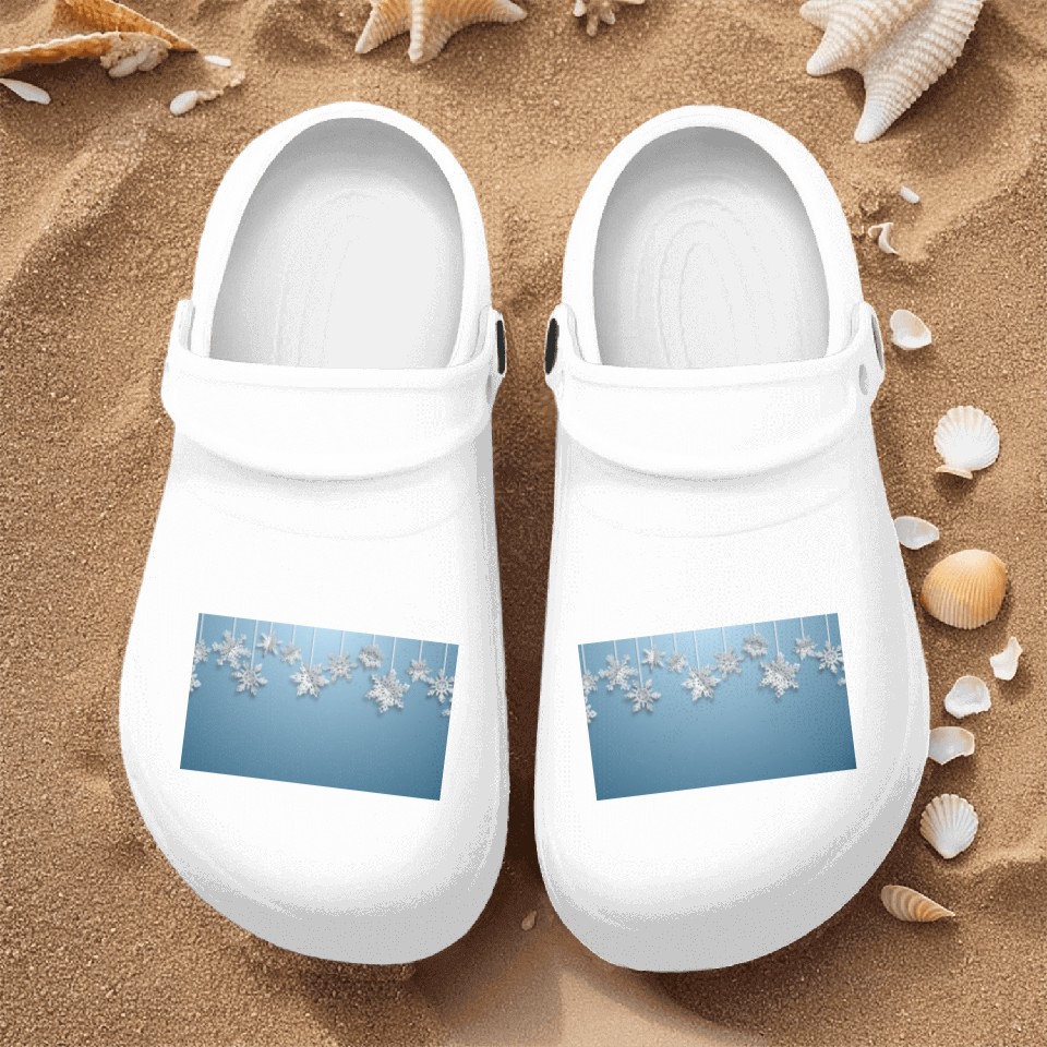 The product unique design you searched for is Elegant Hanging Snowflakes Light Blue Nurse Clogs For Men WHITE belong theme Nurse Clogs at Printblur