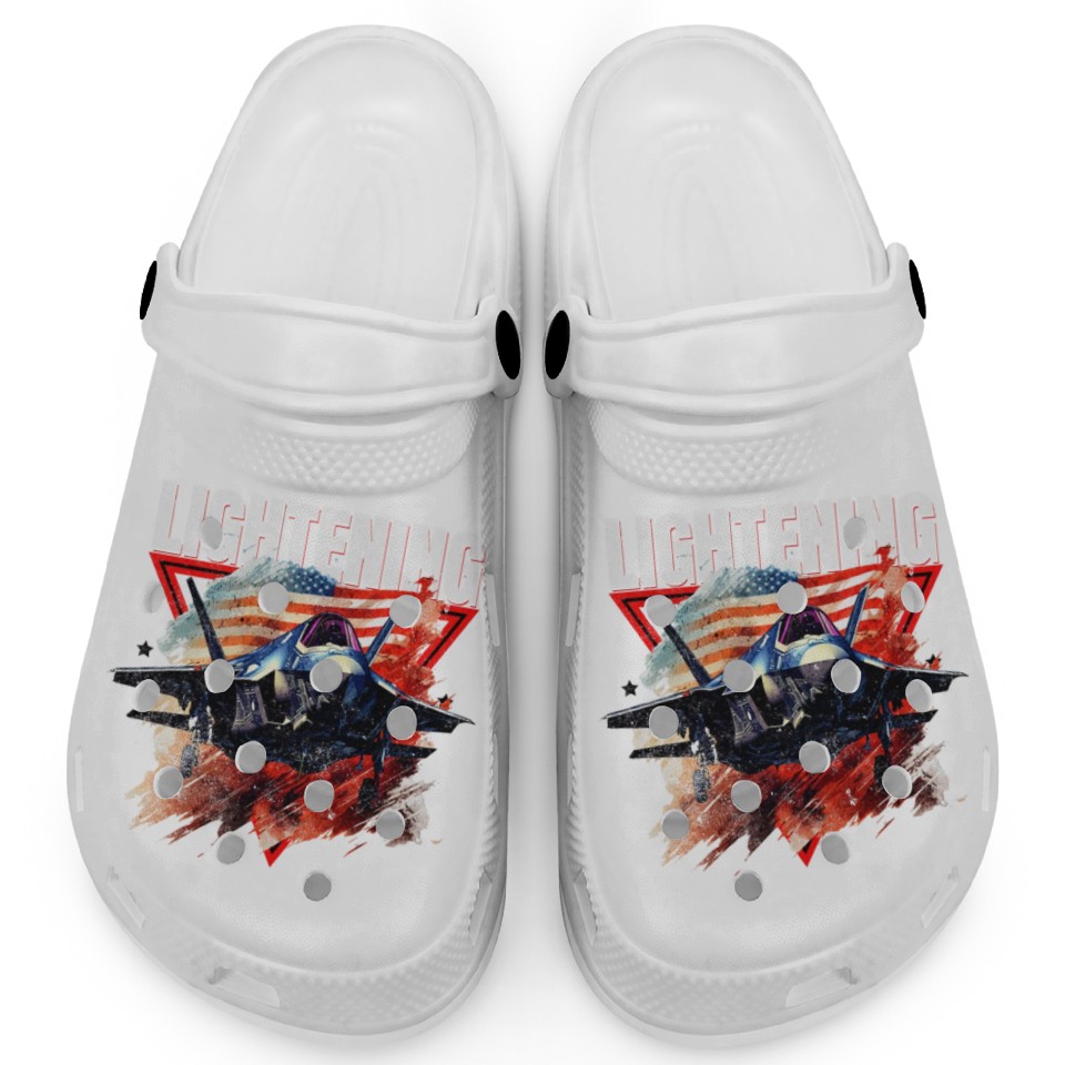 You're looking at the eye-catching product F35 Lightning Fighter Jet Plane Veteran Military Clogs For Kids WHITE belong theme Clogs at Printblur