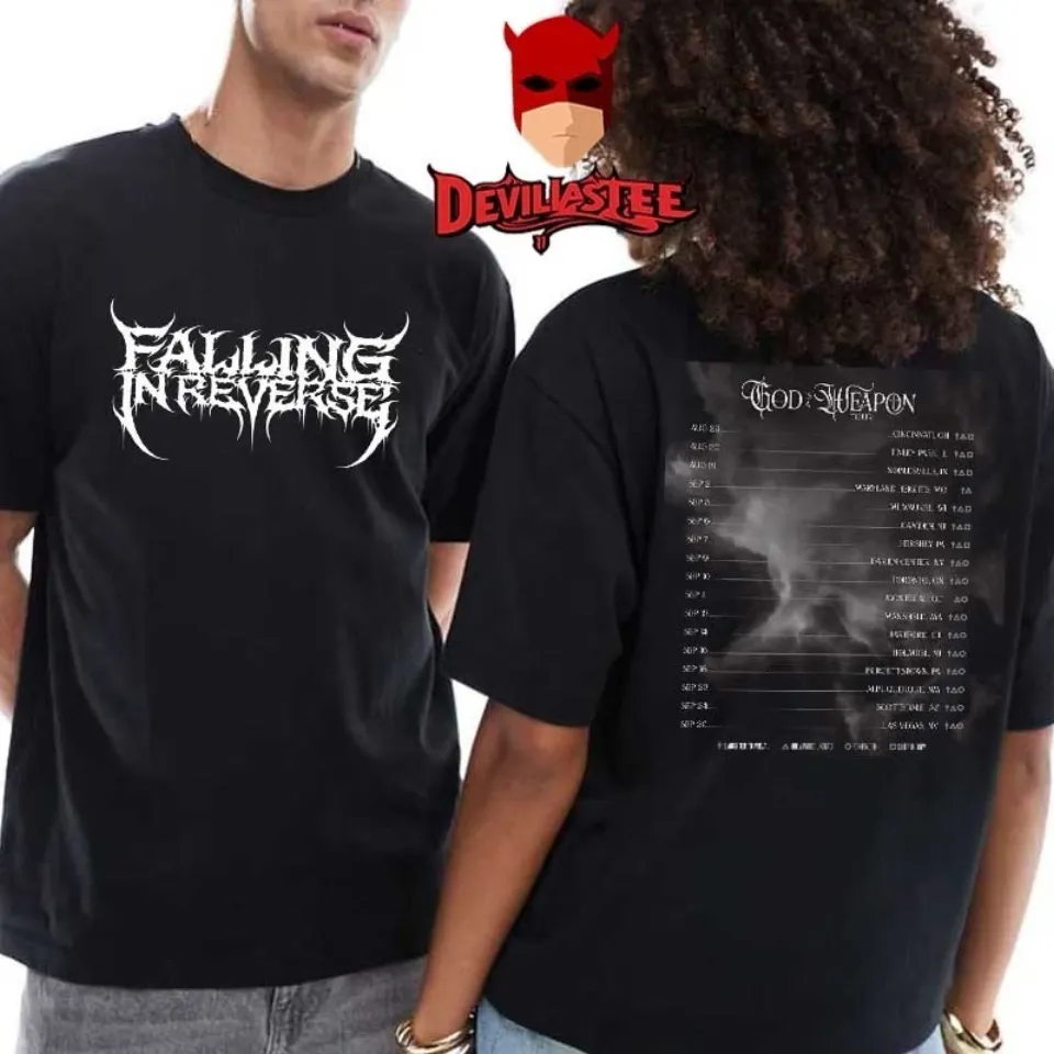 You're taking a peek at the product Falling In Reverse Tour 2025 God Is Weapon Two-Sided T-Shirt For Men Black belong theme Double Sided T-Shirts at Printblur