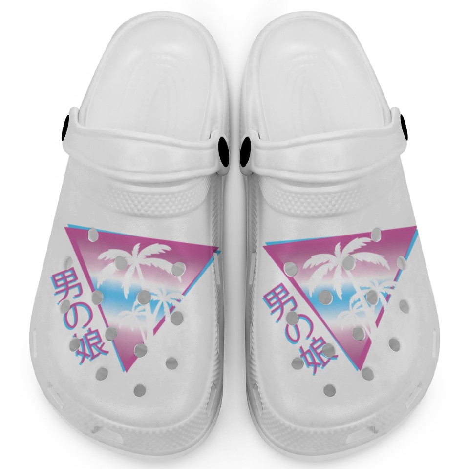 You're taking a peek at the product Femboy 80S 90S Palm Tree Japanese Vaporwave Aesthe Clogs For Kids WHITE belong theme Clogs at Printblur