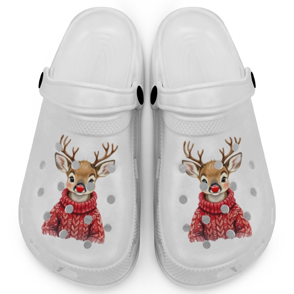 You are shopping for a stunning and trendy product Festive Reindeer with Red Nose Sweater Clogs For Kids WHITE belong theme Clogs at Printblur