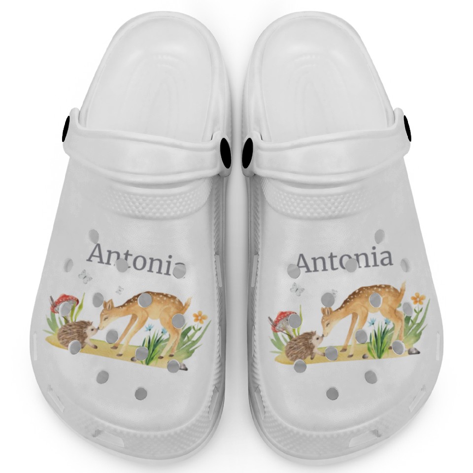 Forest Animal Deer Hedgehog Flowers Name Antonia Clogs