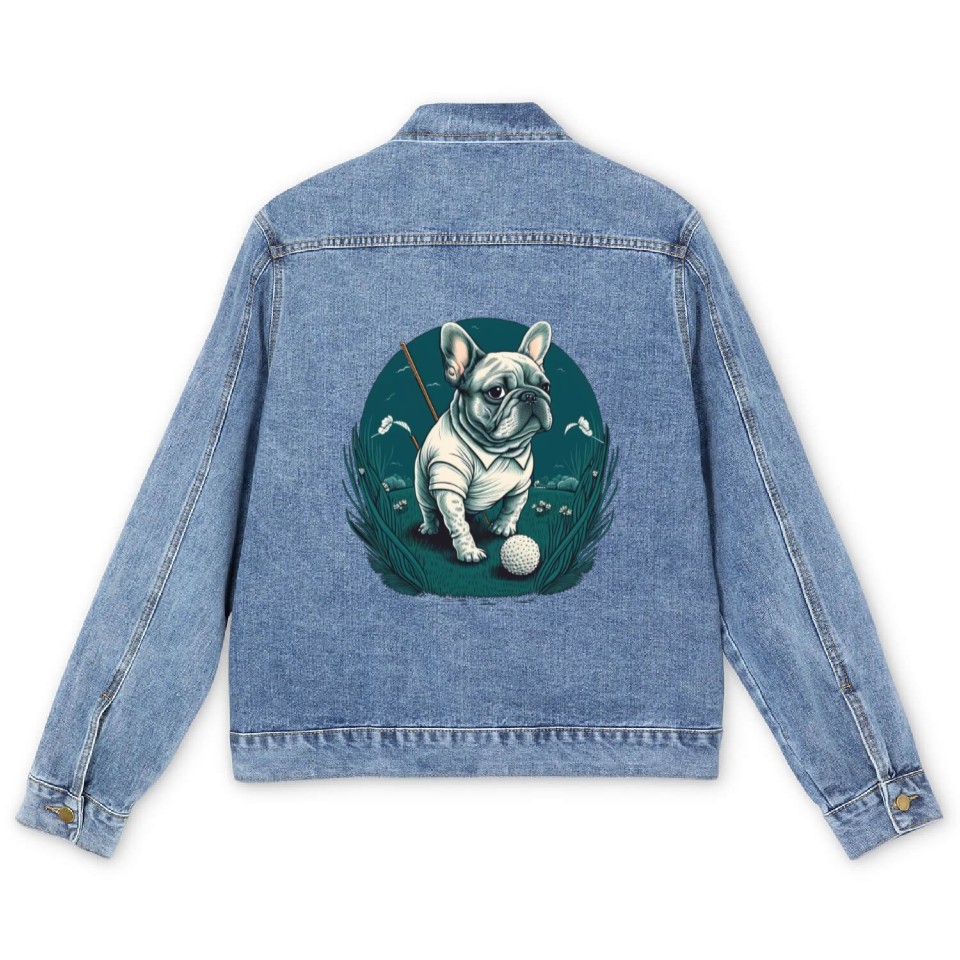 Own fascinating French Bulldog | Golf Sport Player Cute Frenchie Men's Denim Jackets or see more Men's Denim Jackets products now from Printblur shop to enjoy your shopping time!