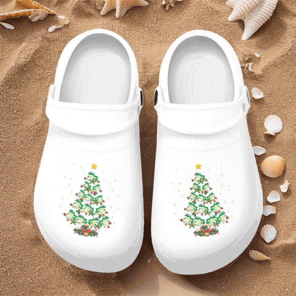 The product unique design you searched for is Frogs Lover Xmas Gift Frog Christmas Tree Nurse Clogs For Men WHITE belong theme Nurse Clogs at Printblur