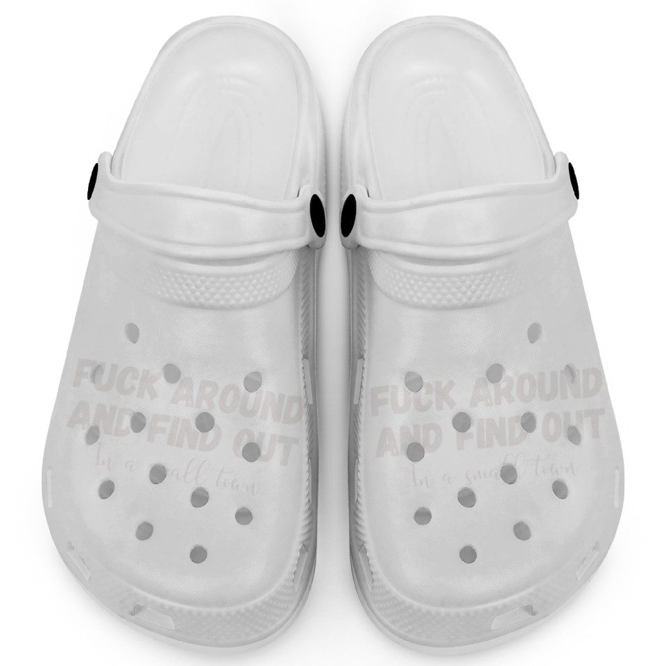 You are seeing a unique and impressive product Fuck Around And Find out, in a small town Clogs For Kids WHITE belong theme Clogs at Printblur