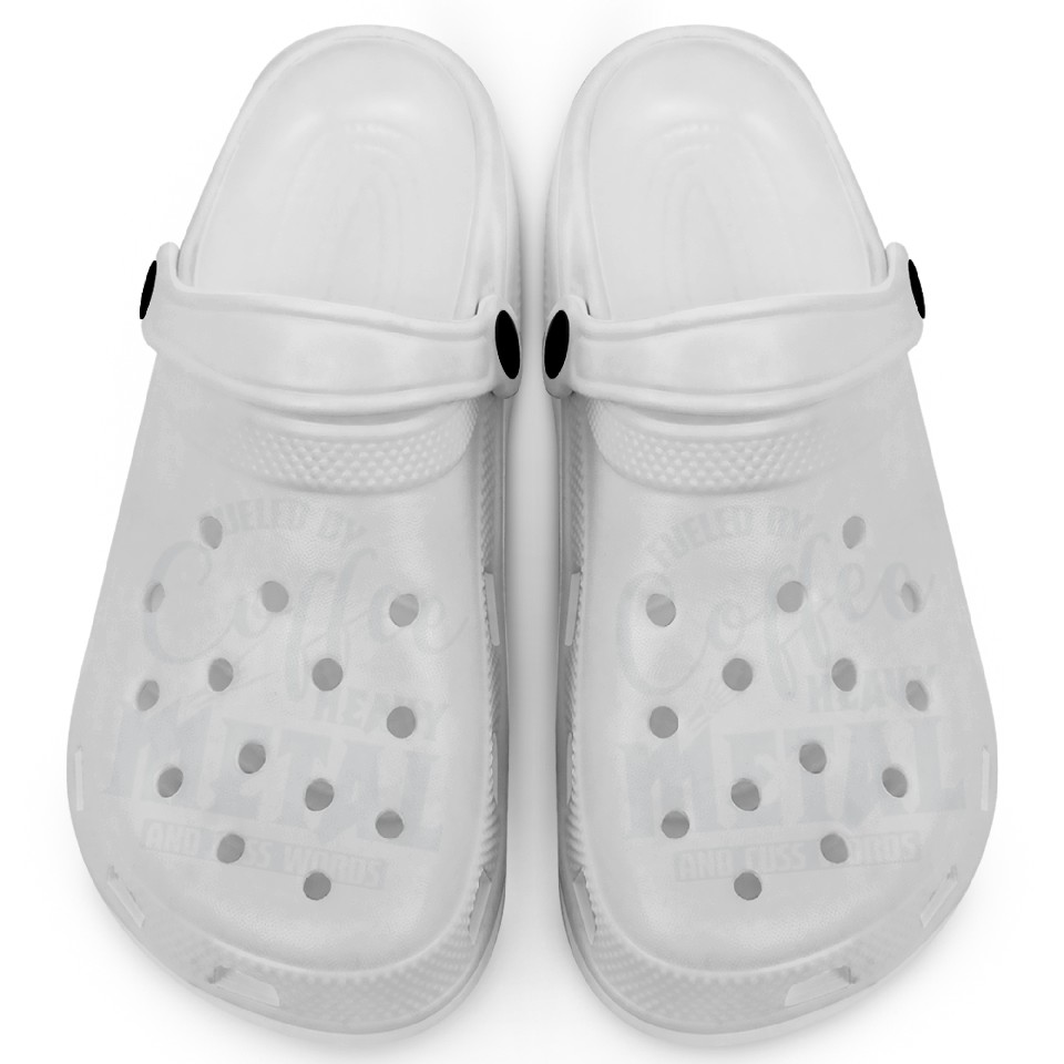 You are seeing a unique and impressive product Fueled by Coffee Heavy Metal and cuss Words Clogs For Kids WHITE belong theme Clogs at Printblur