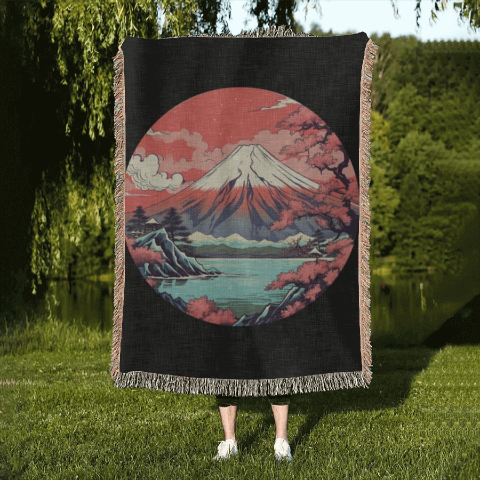 You are viewing an exclusive and elegant product Fuji Sakura Serenity: Japanese Landscape Bliss Woven Blankets For Black belong theme Woven Blankets at Printblur