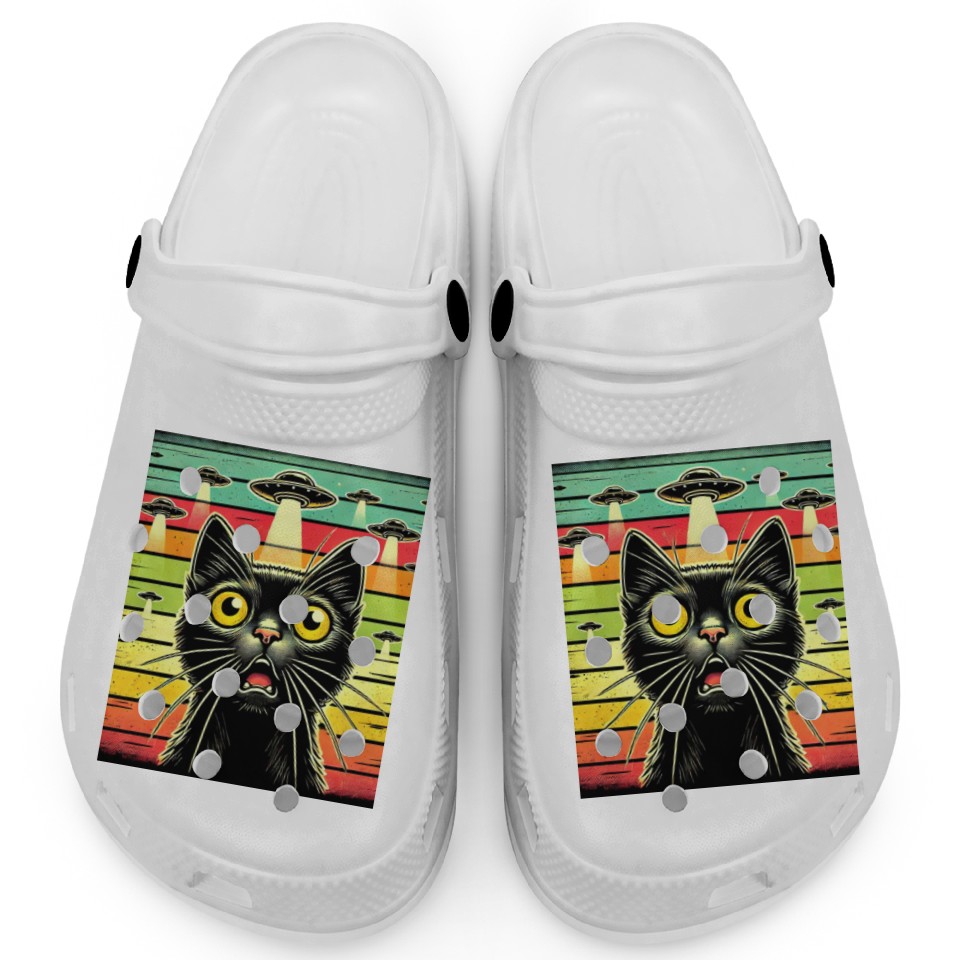 You are seeing a unique and impressive product Fun Cat sunset Galaxy Cat Spaceship Alien Cat UFOs Clogs For Kids WHITE belong theme Clogs at Printblur
