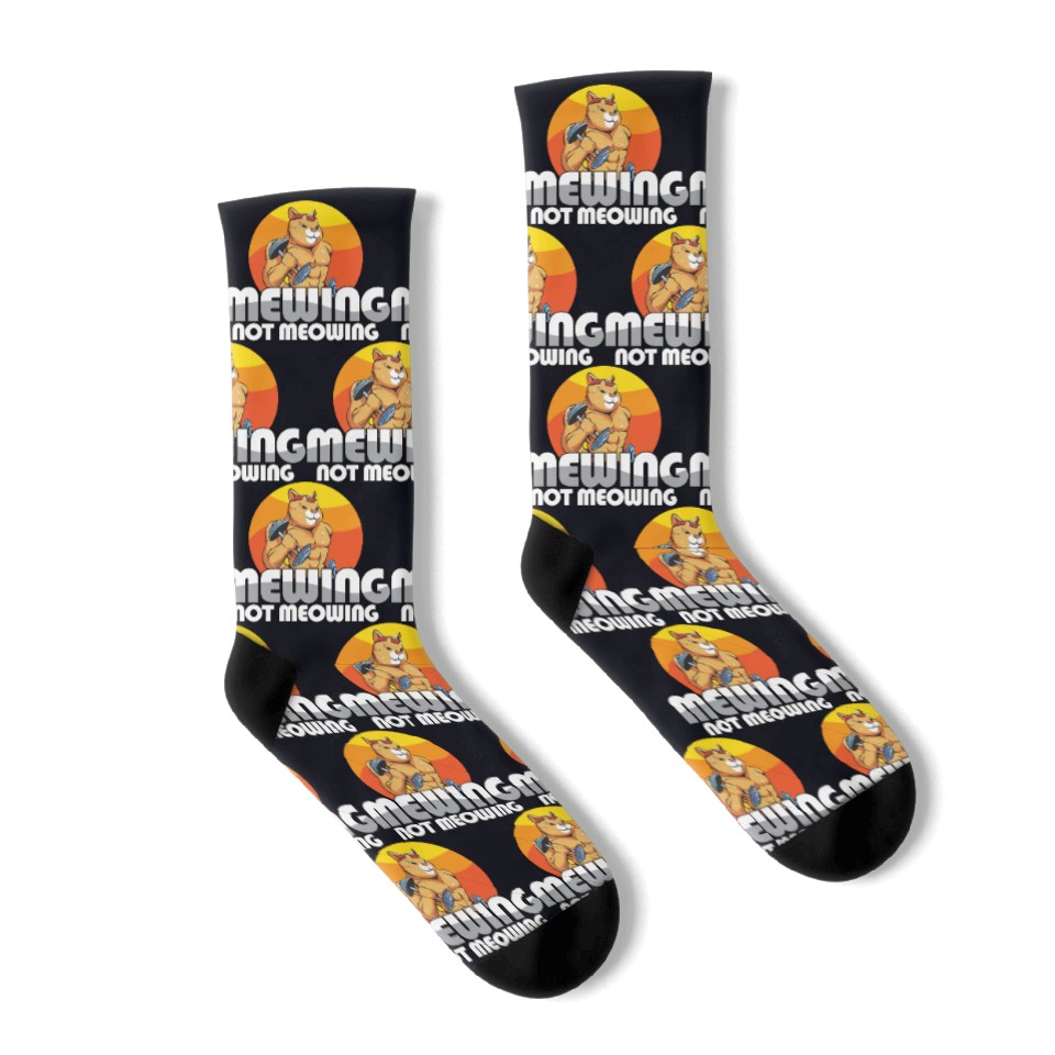 Buy stunning Funny Cat Meme Mewing Not Meowing Jawline Socks or see more Socks products at Printblur right now to receive many amazing discounts!