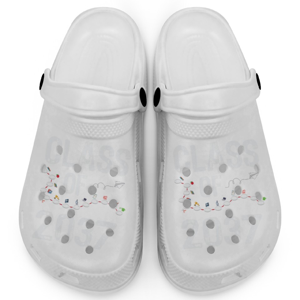 You're taking a peek at the product Funny Class of 2037 Grow With Me Back To School Clogs For Kids WHITE belong theme Clogs at Printblur