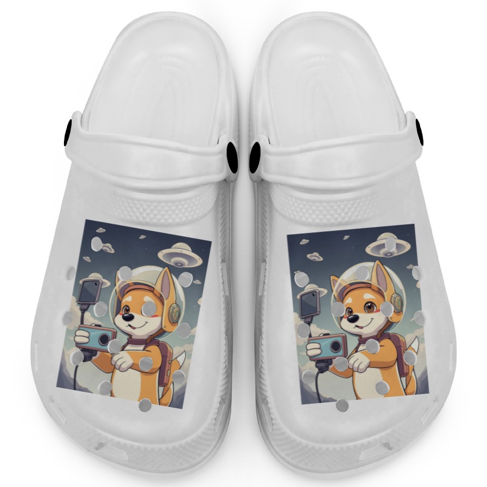 You are viewing an exclusive and elegant product Funny Dog Rescue Anime Selfie with UFOs Weird Clogs For Kids WHITE belong theme Clogs at Printblur