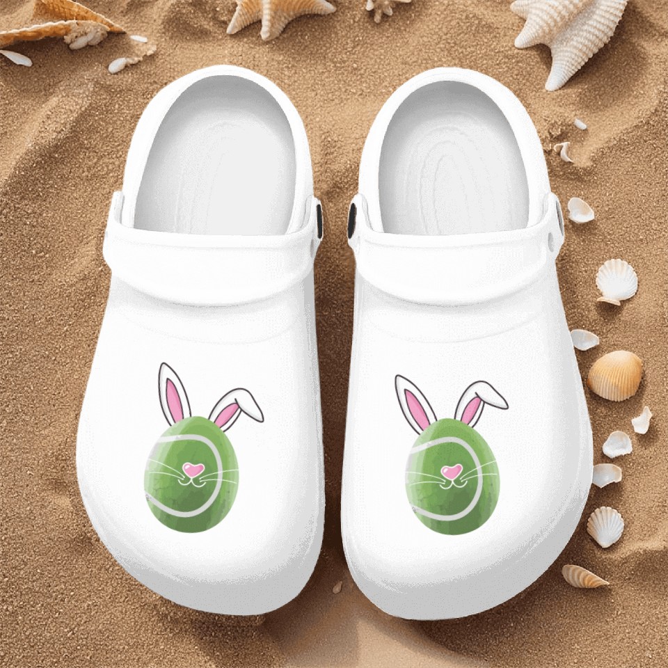 The product unique design you searched for is Funny Easter Easter Egg Tennis Tennisball Nurse Clogs For Men WHITE belong theme Nurse Clogs at Printblur