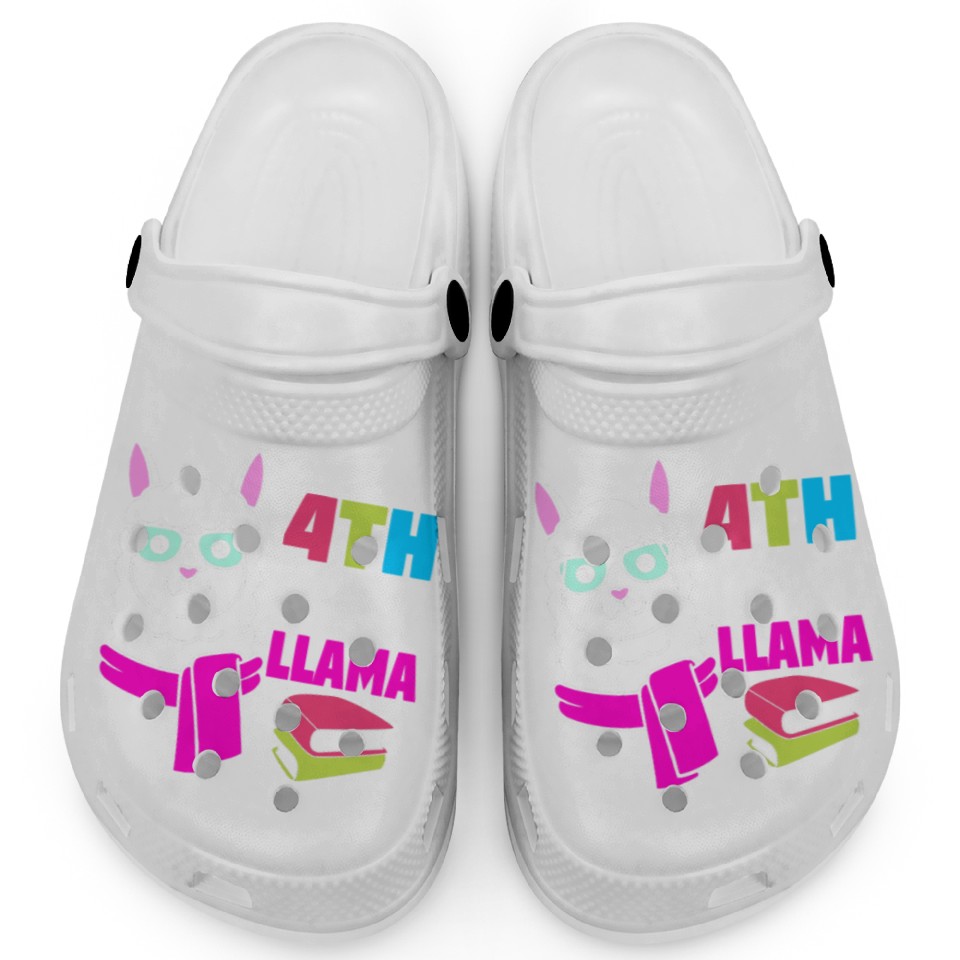 You're searching for a one-of-a-kind product Funny Llama Back To School 4th Grade No Prob Llama Clogs For Kids WHITE belong theme Clogs at Printblur