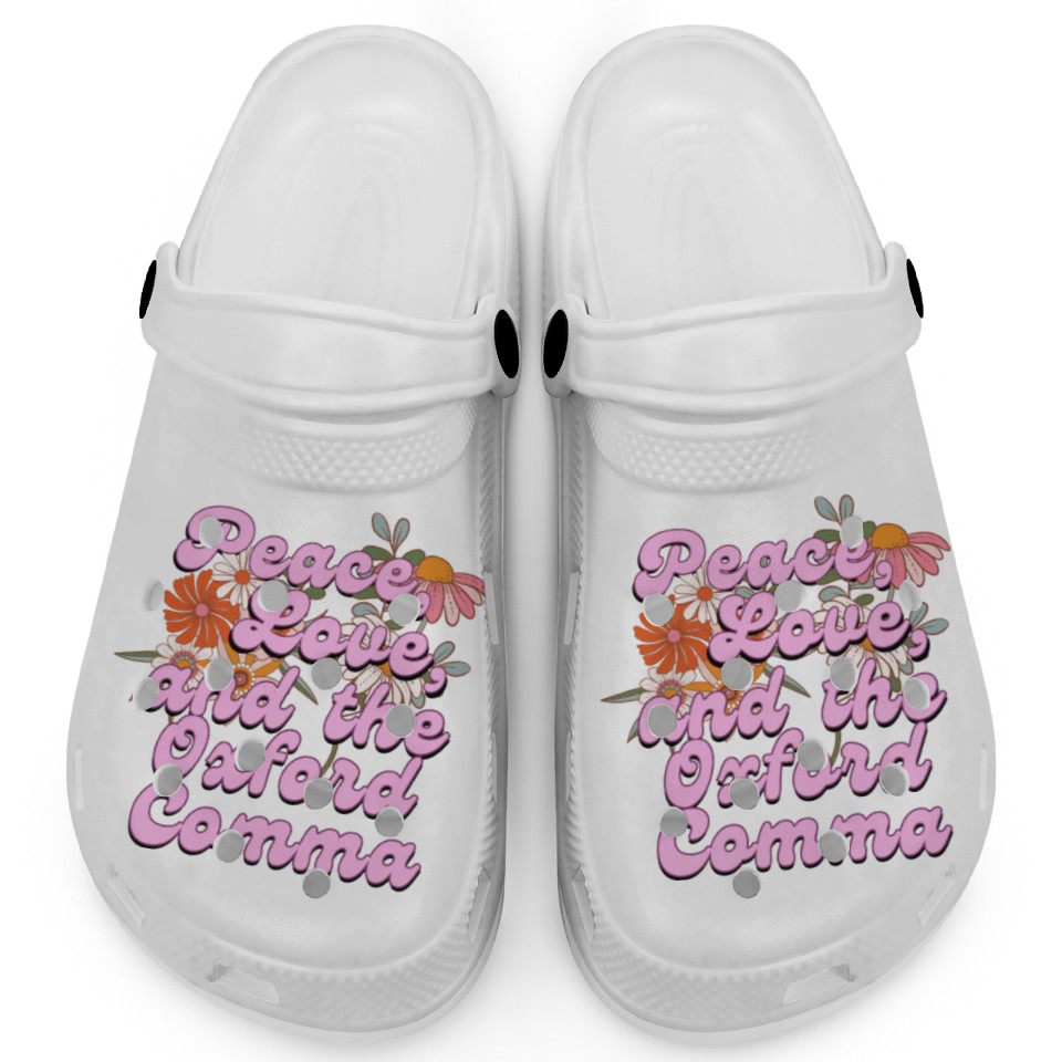 Buy stunning Funny Oxford Comma Peace Love and the Oxford Comma Clogs or see more Clogs products at Printblur right now to receive many amazing discounts!