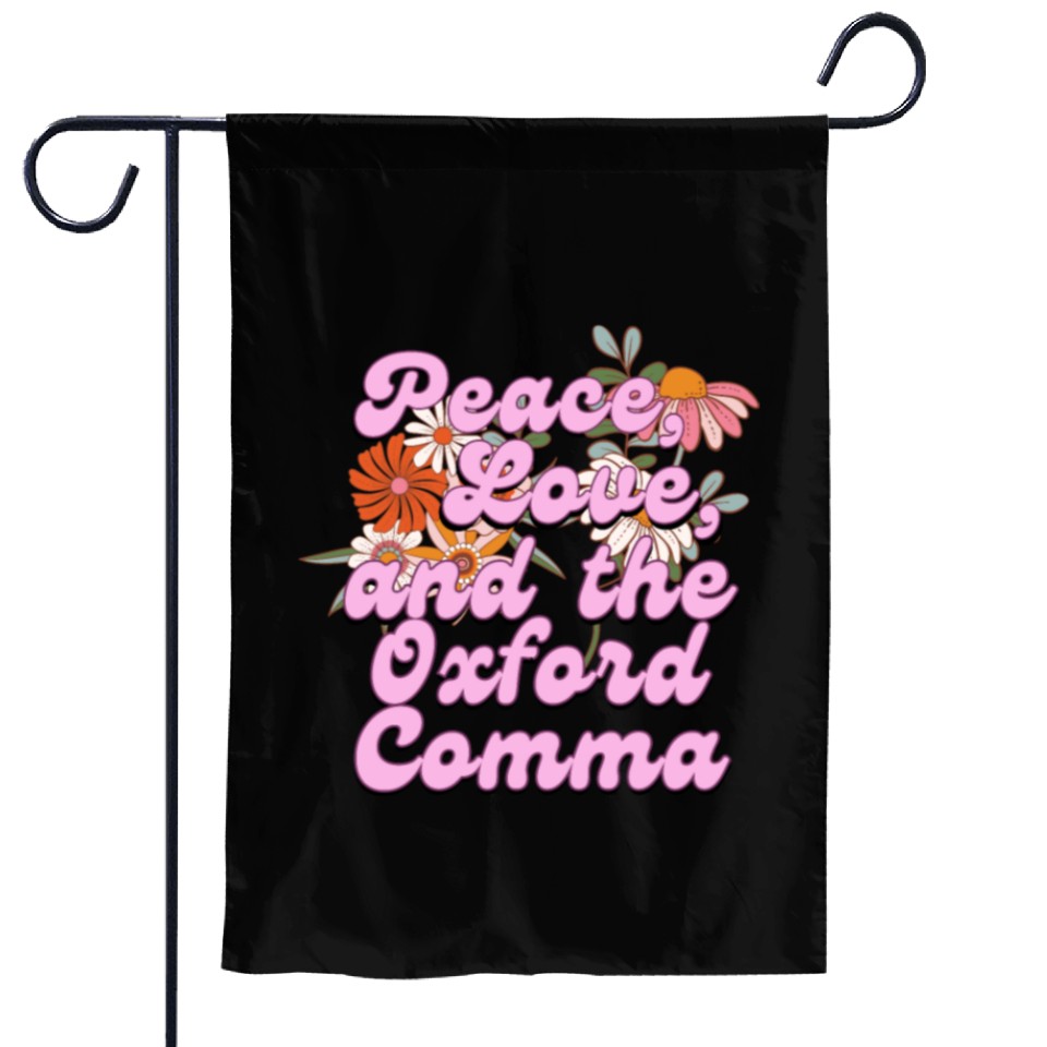 Shop for attractive Funny Oxford Comma Peace Love and the Oxford Comma Garden Flags or see more Garden Flags products on https://printblur.com right now!