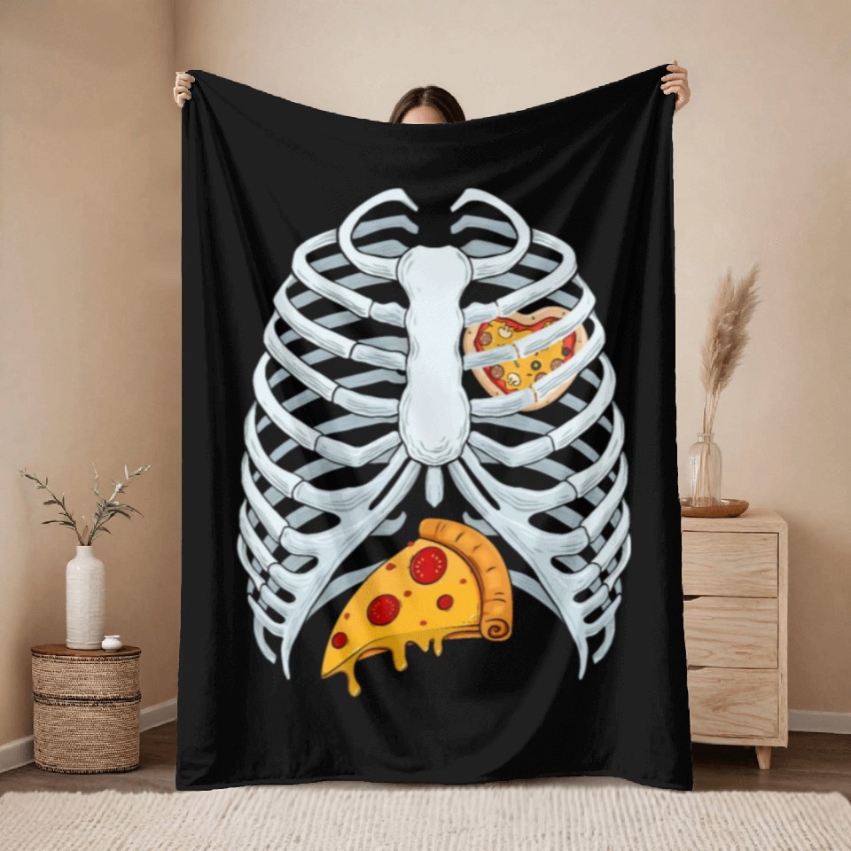 You are shopping for a stunning and trendy product Funny PIzza Skeleton Rib Cage Halloween Costume Throw Blankets For Black belong theme Throw Blankets at Printblur