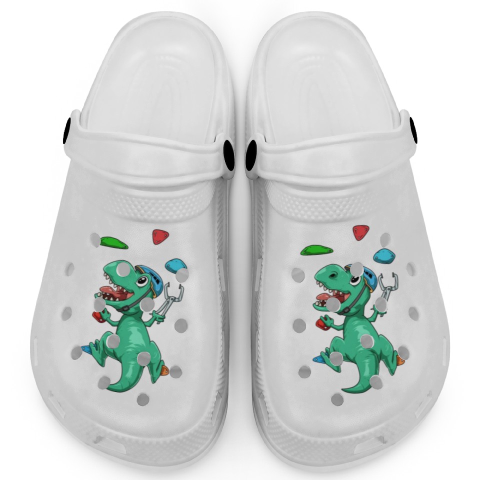 The item hot trend you're looking at is Funny T-Rex Bouldering and Rock Climbing Gift Clogs For Kids WHITE belong theme Clogs at Printblur