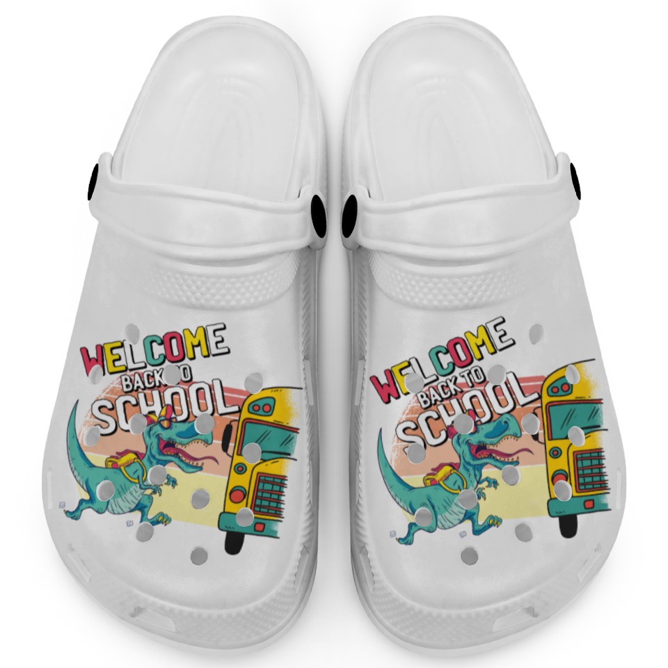 You are shopping for a stunning and trendy product Funny T-Rex Running to School Bus Welcome Back to Clogs For Kids WHITE belong theme Clogs at Printblur