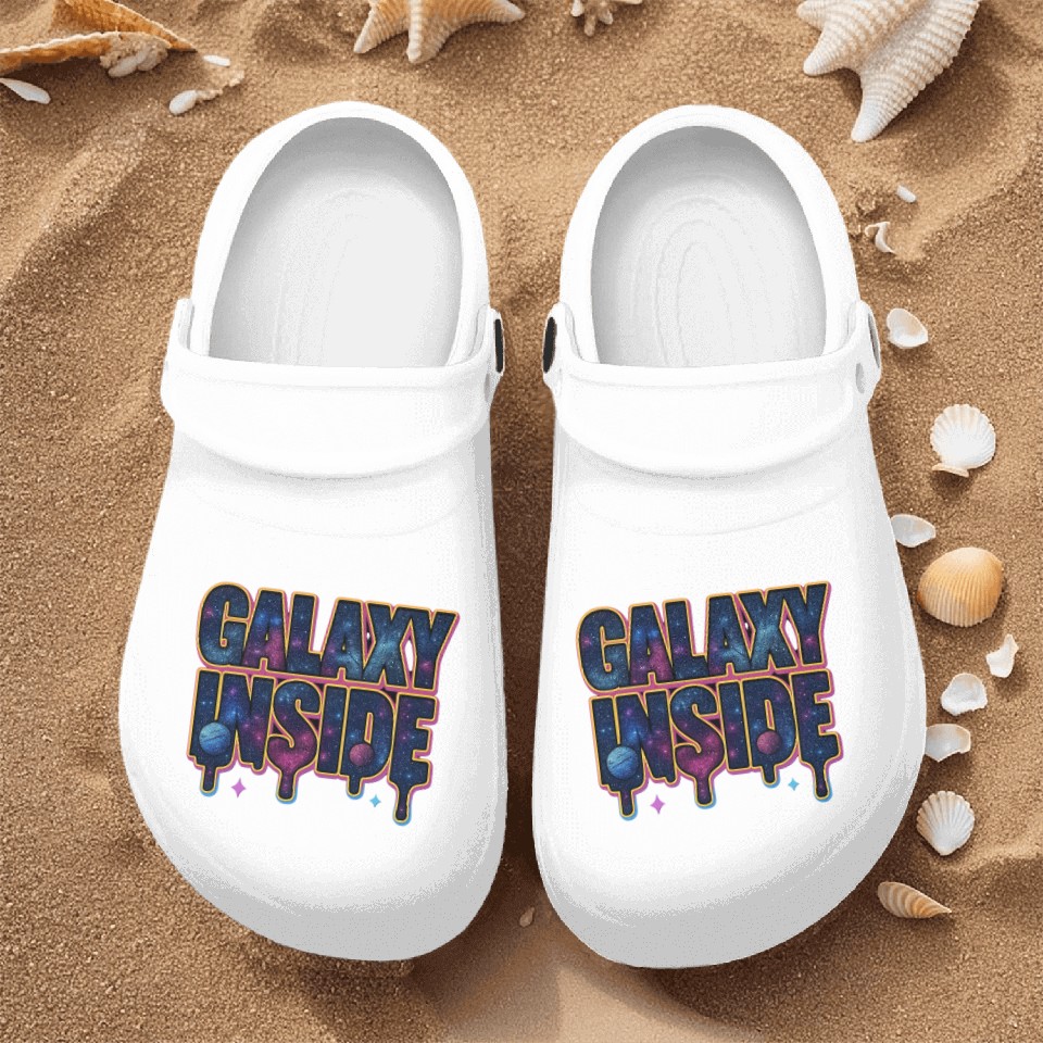 You're taking a peek at the product Galaxy Inside Cosmic Typography Nurse Clogs For Men WHITE belong theme Nurse Clogs at Printblur