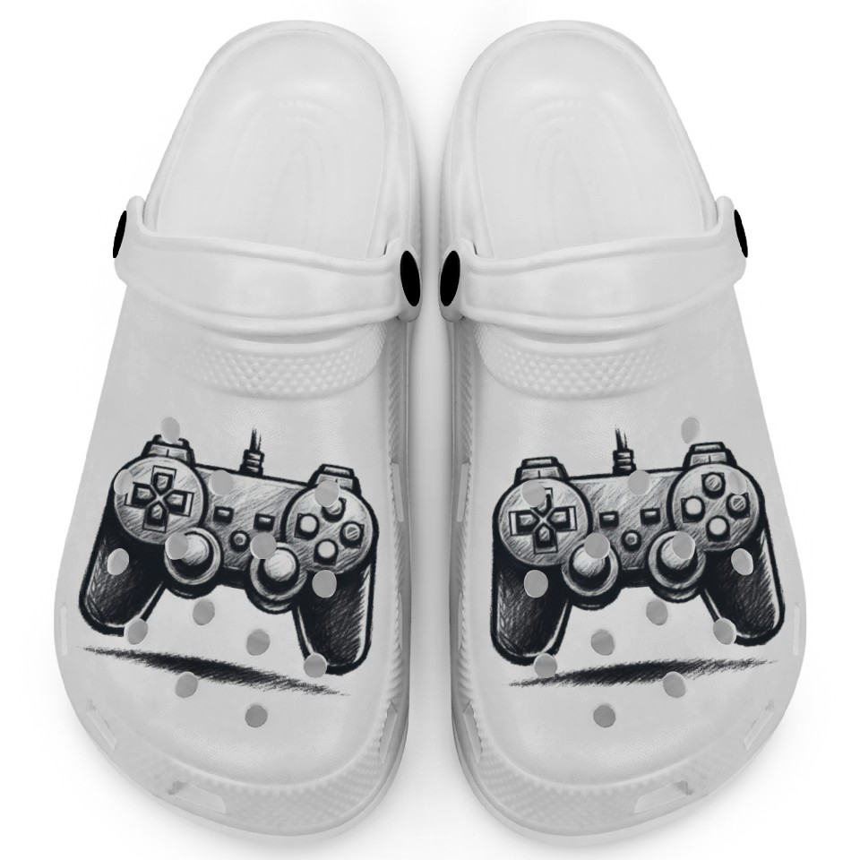 The product unique design you searched for is Gamer Controller Cartoon Charcoal Gaming Art Clogs For Kids WHITE belong theme Clogs at Printblur