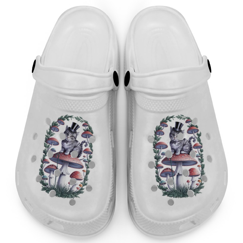 Gentleman cat hatter sitting on mushroom Clogs
