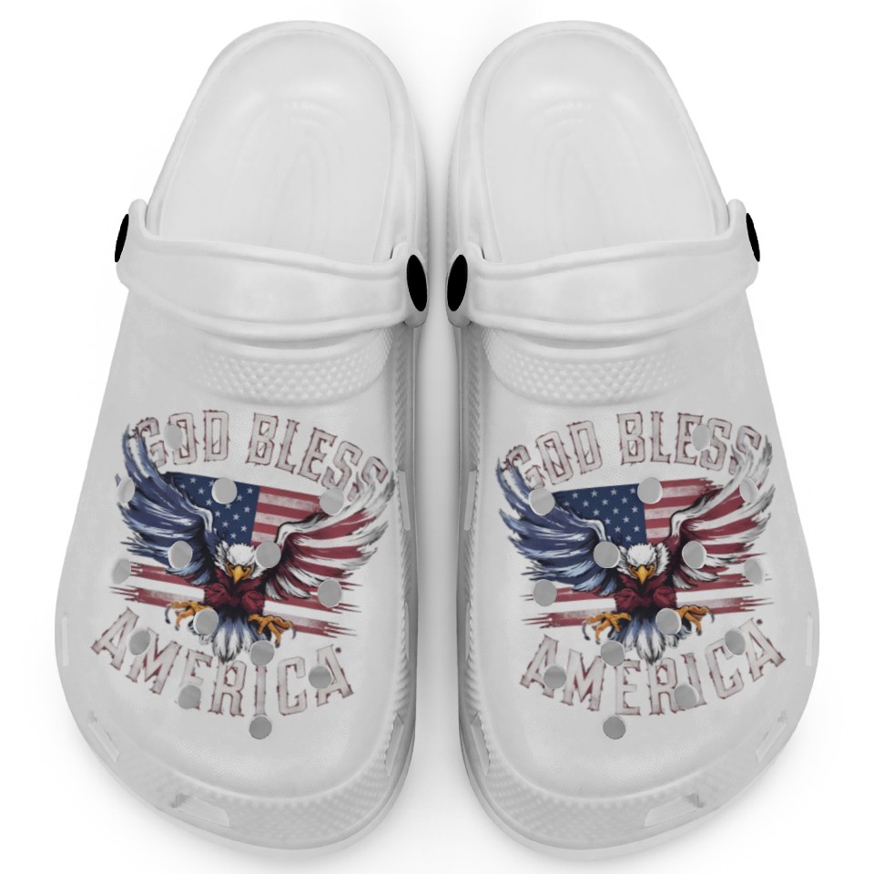 You are viewing an exclusive and elegant product God Bless America Eagle Happy 4th Of July US Flag Clogs For Kids WHITE belong theme Clogs at Printblur